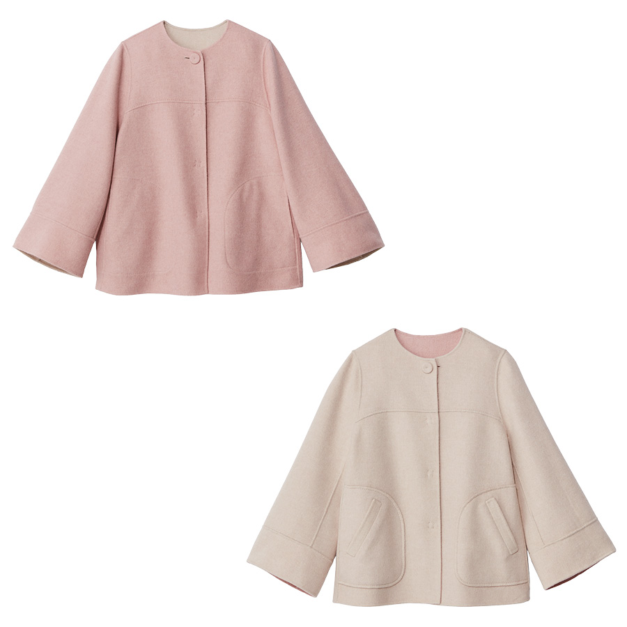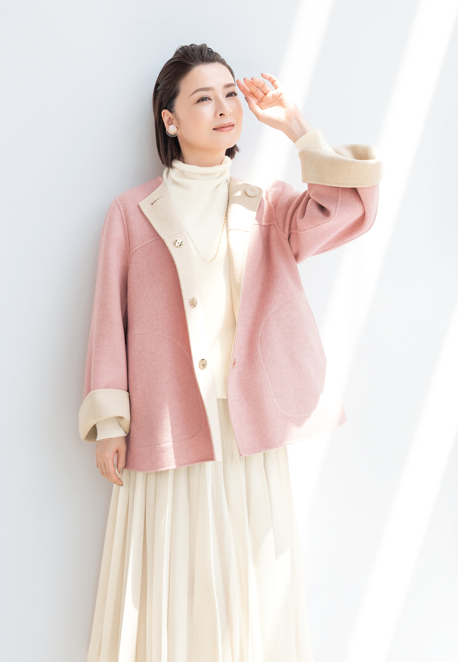 イタリア・MANTECO社製のリバー素材で仕立てた淡いピンクのコートが、ホワイトのワントーンスタイルに、甘いときめきを添えて。 -