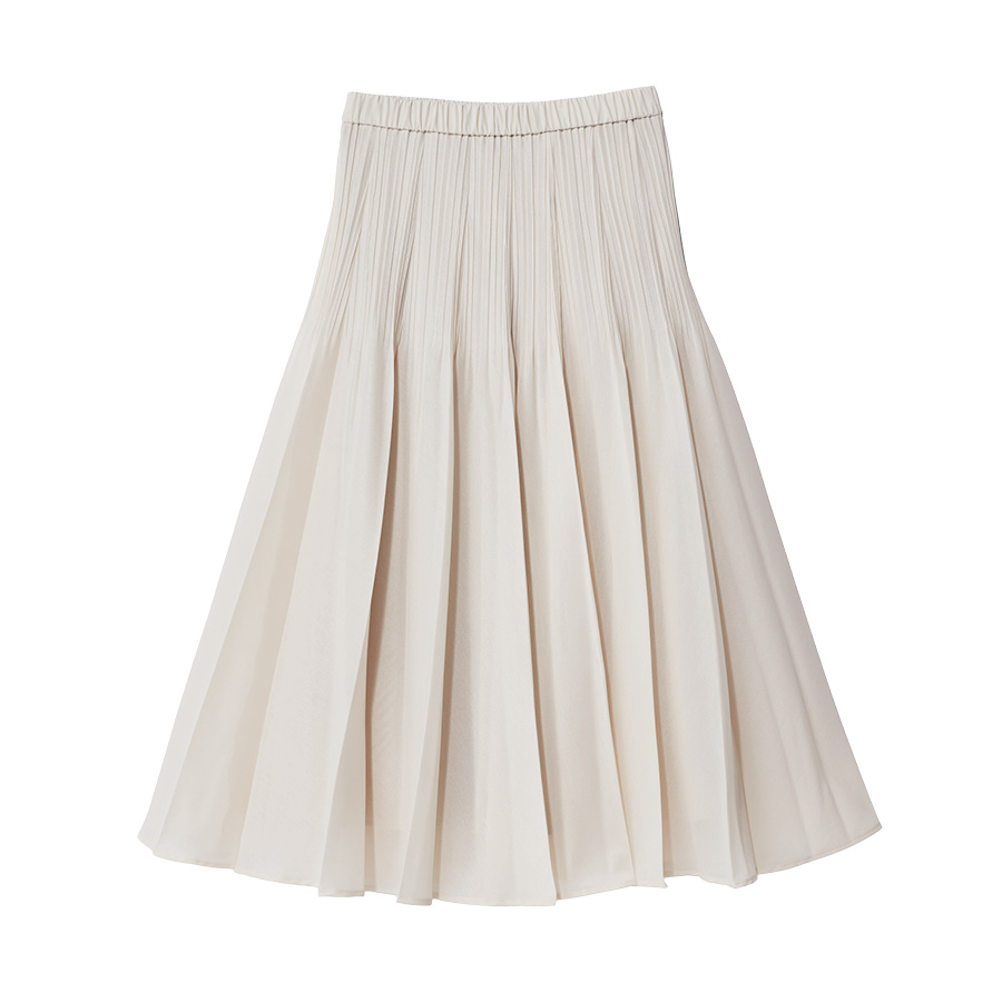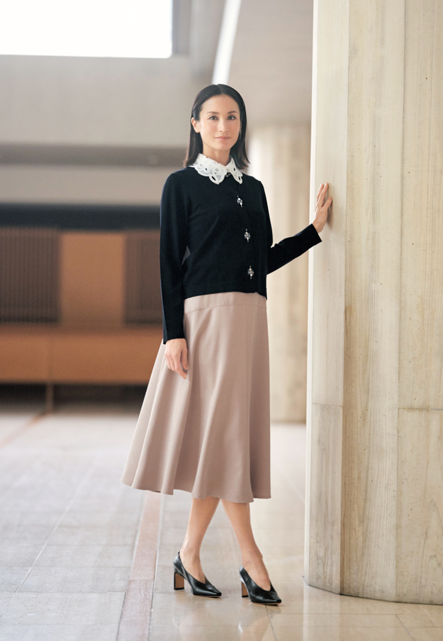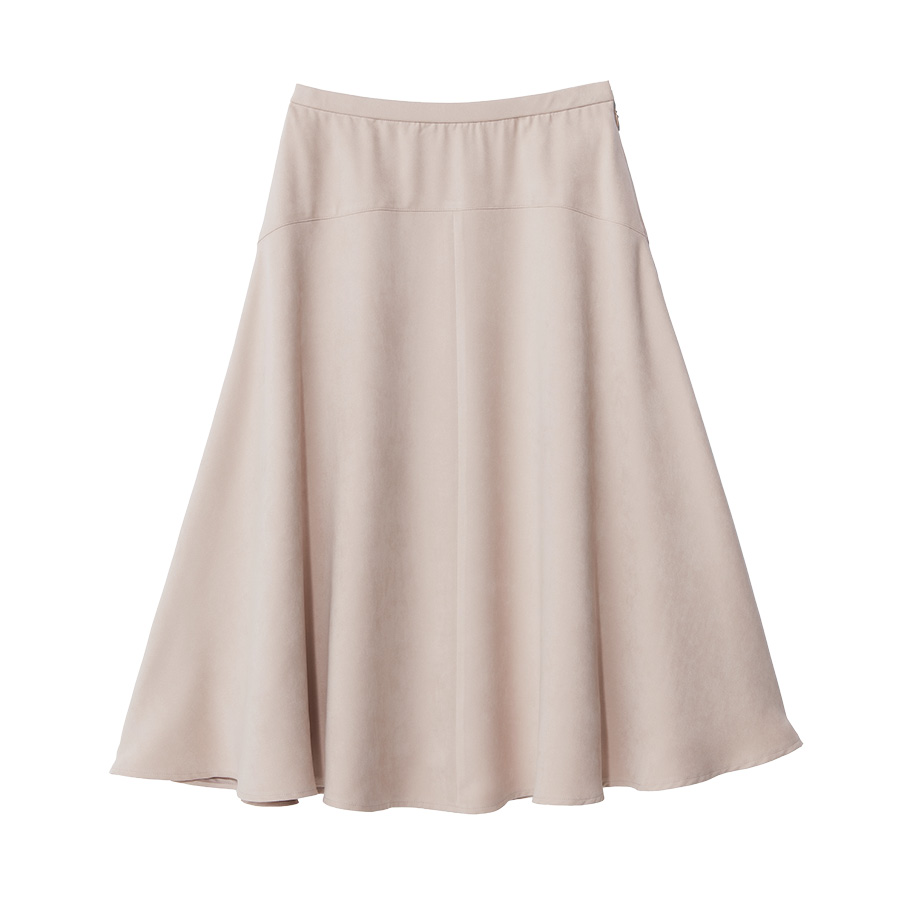 柔らかなエクリュカラーのスエードライクスカートを合わせた、特別なシーンを彩るエレガントな着こなし。 -