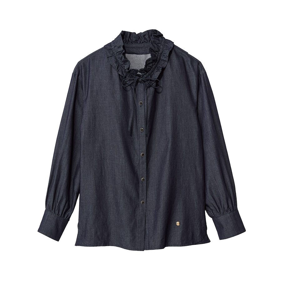 マスキュリンでありながら襟元のフェミニンなディテールが、纏う人の女性らしさを引き立てる。 -
