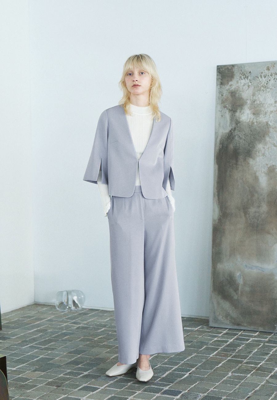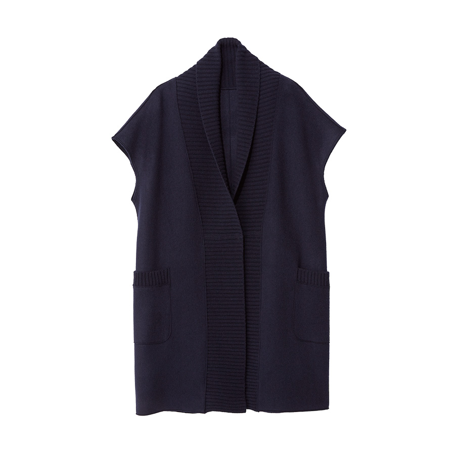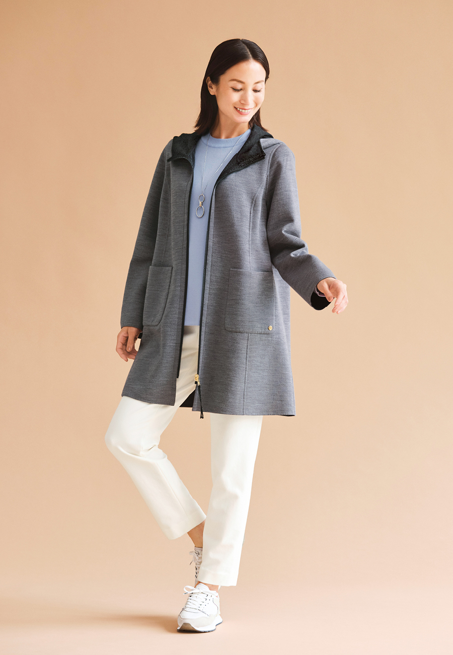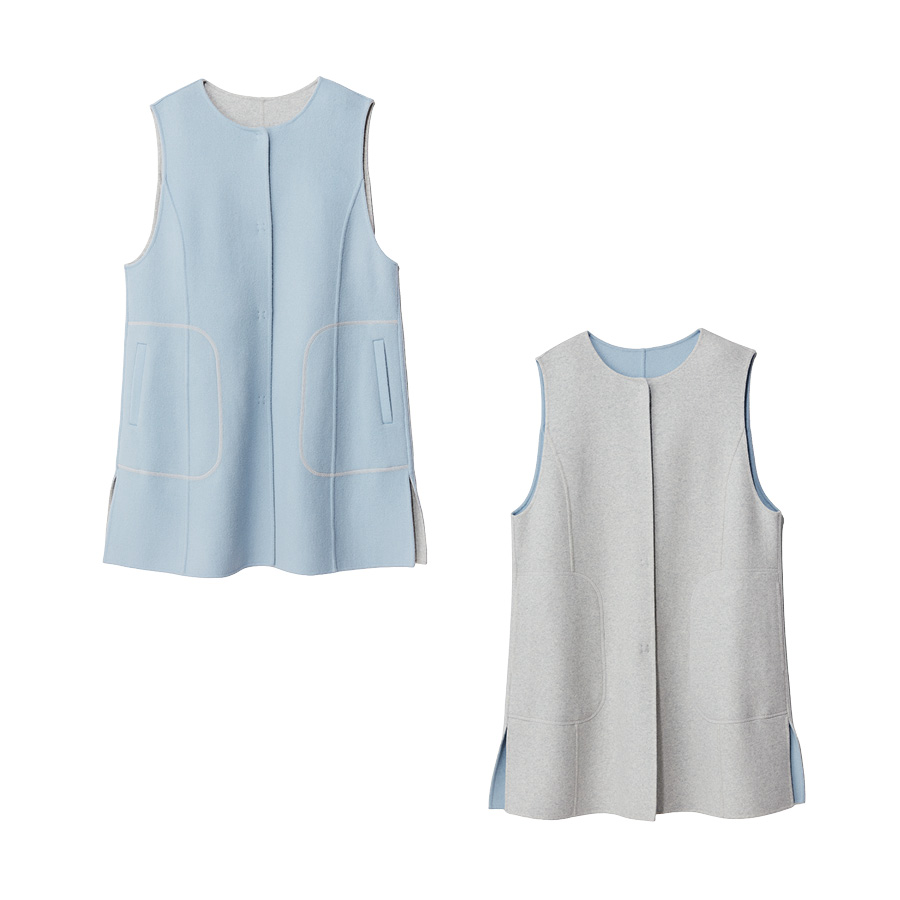 ■With Sophisticated Style薄くしなやかな深喜毛織のリバージャージー素材で仕立てたジレは、淡いトーンのリバーシブル仕様です。