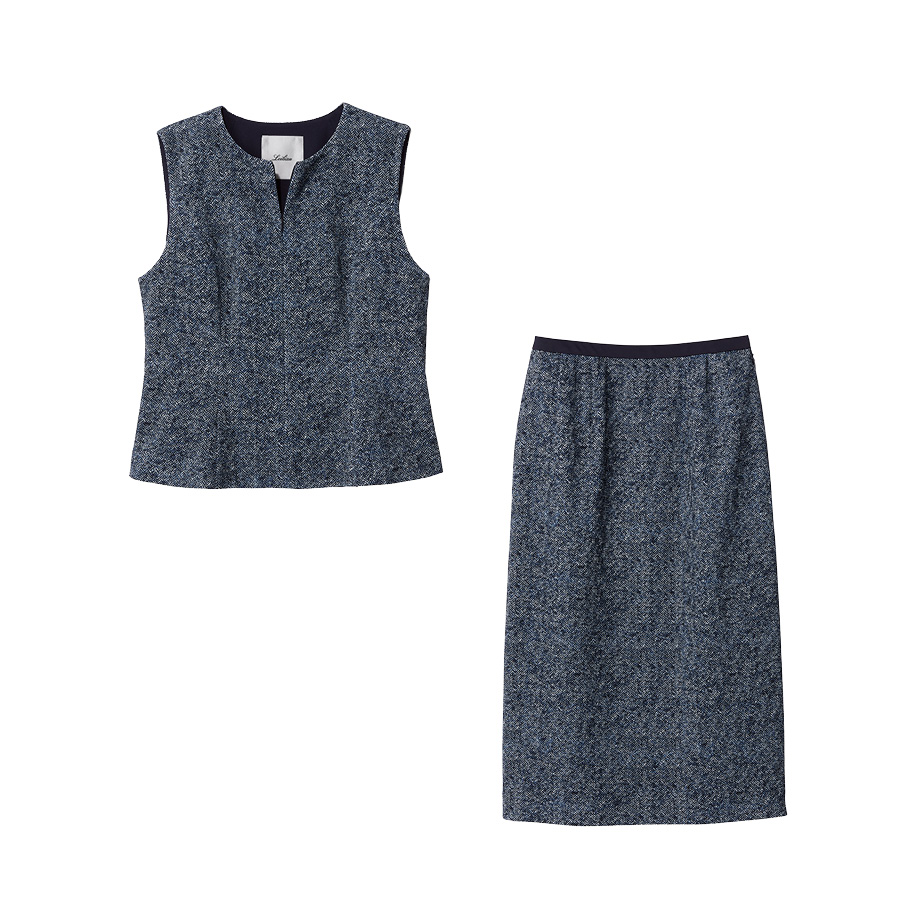 ジレ&スカートのツイード調スーツは、体に寄り添うしなやかなジャージー素材。