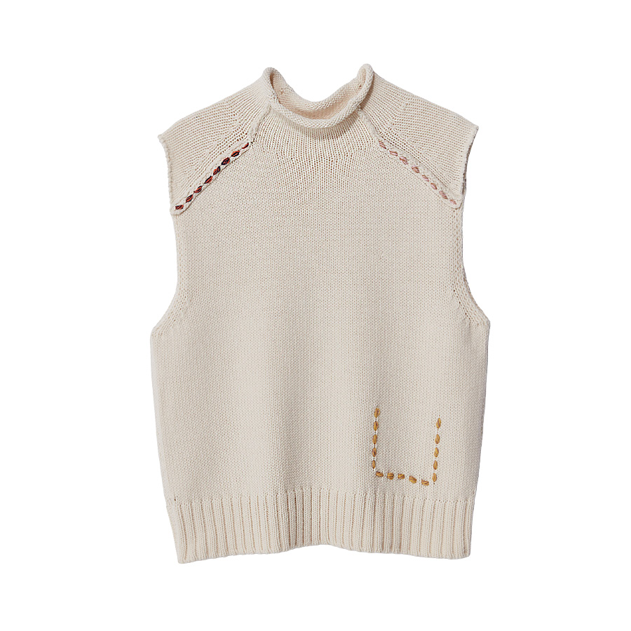 配色ステッチをあしらったニットジレを合わせたレイヤードスタイルも、ゆとりのあるフォルムが心地よく受けとめます。 -
