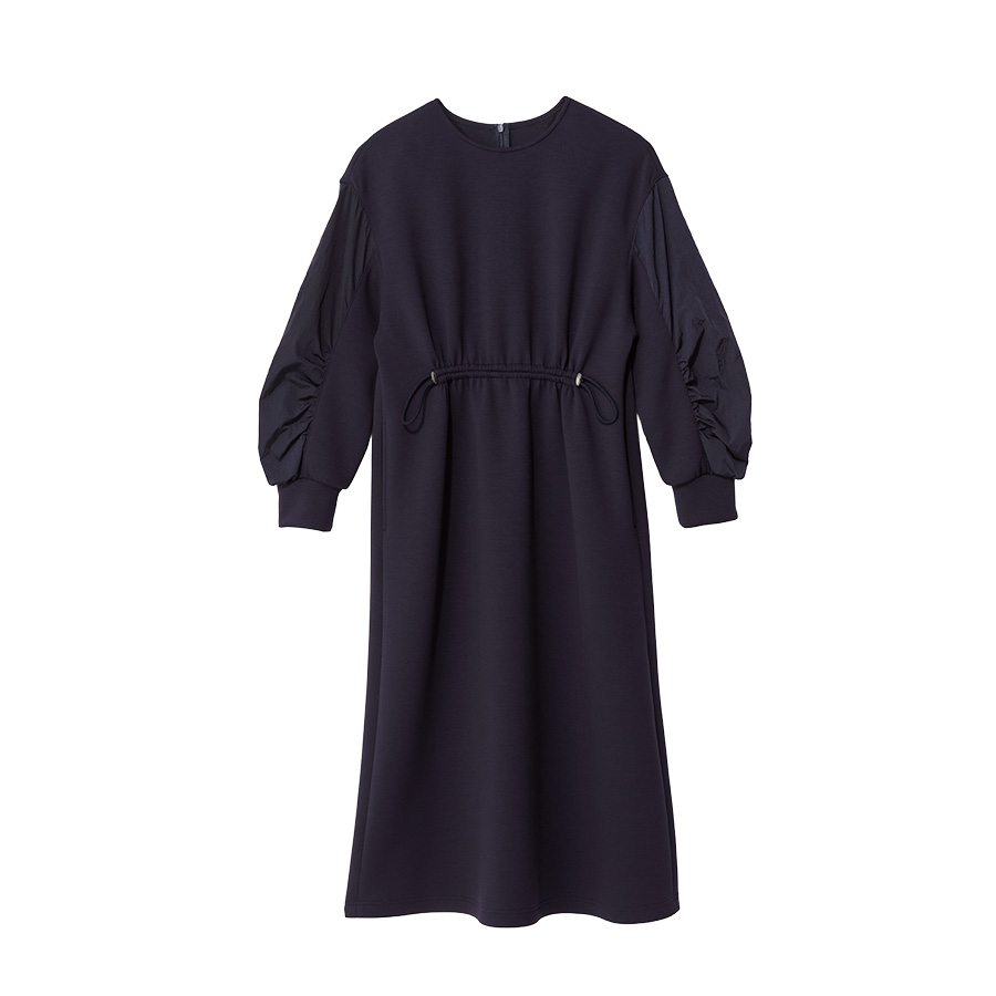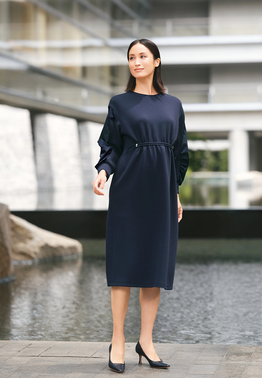 ■With Sophisticated Style滑らかなジャージー素材のワンピースは、袖に施された異素材切り替えやウエストのドローストリングがこなれ感を演出。