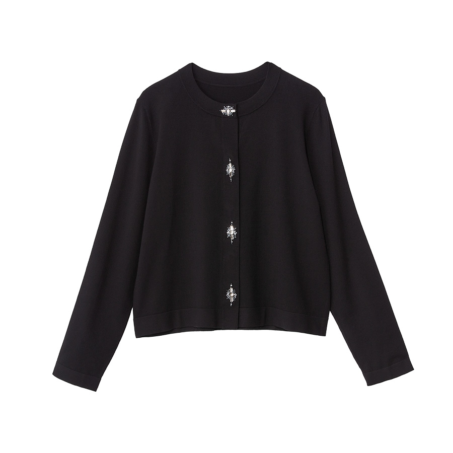 ■With Sophisticated Style上品に輝くビジューカーディガンに、顔映りのよいレースのつけ襟をプラスしてより一層華やかに。