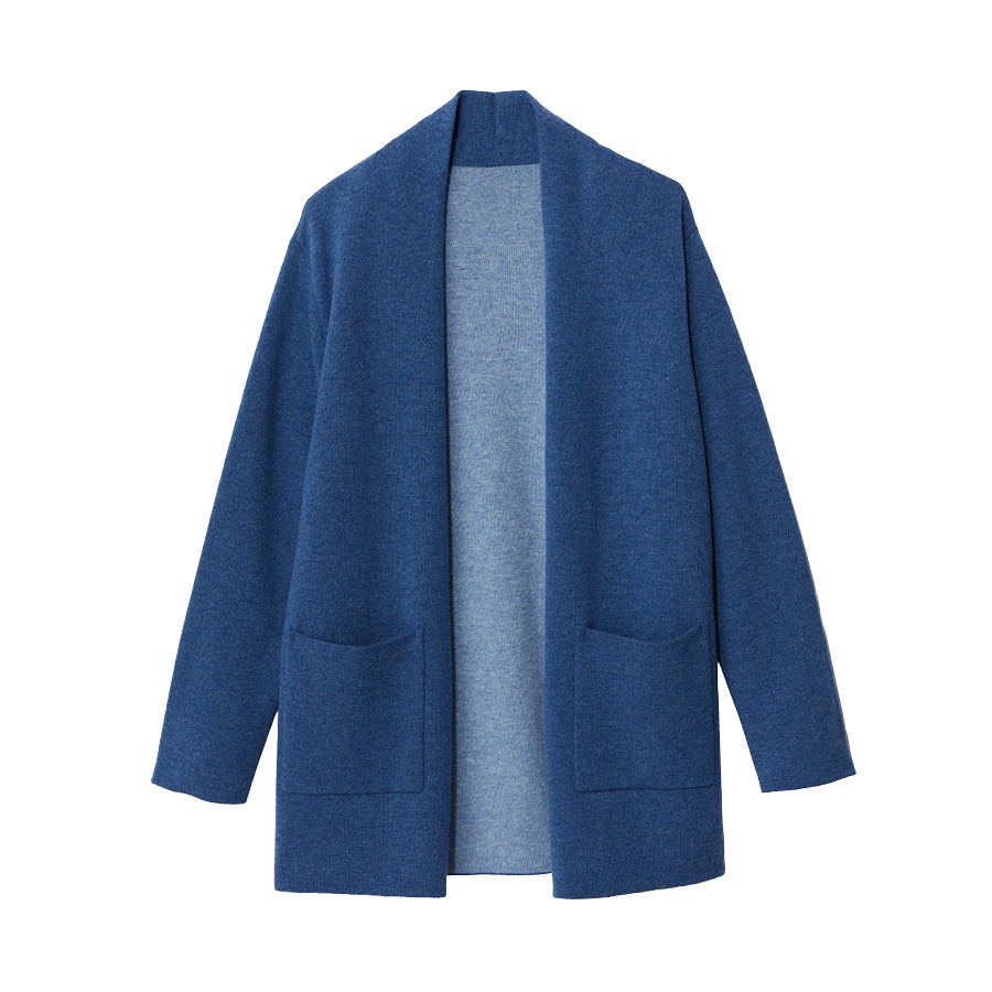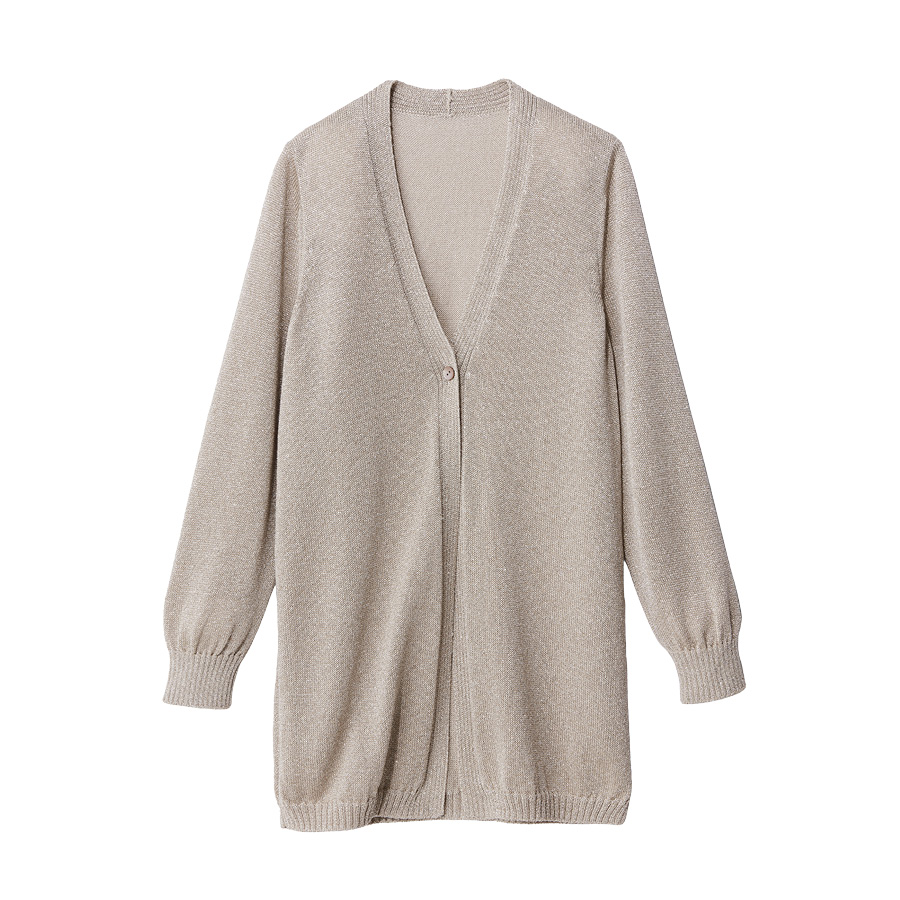 ■With Sophisticated Style繊細なラメが煌めくロングカーディガンは、表と裏に別糸を使うプレーティング編みにすることで優しい肌触りを実現。