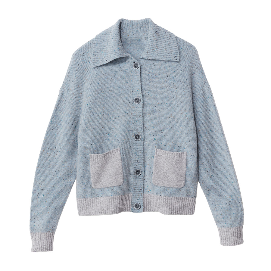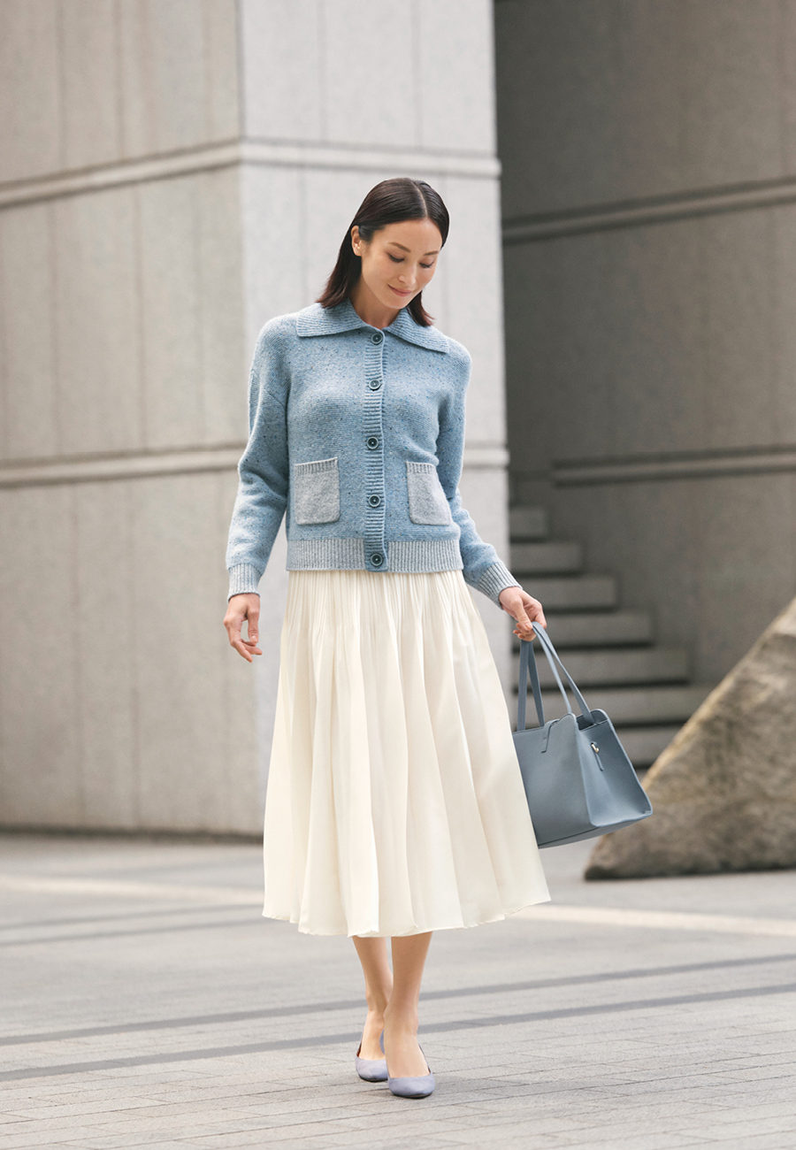 ■With Sophisticated Style温かみあるネップの風合いや配色ポケットがアクセントのカーディガンと、ロマンティックに揺れるプリーツスカート。