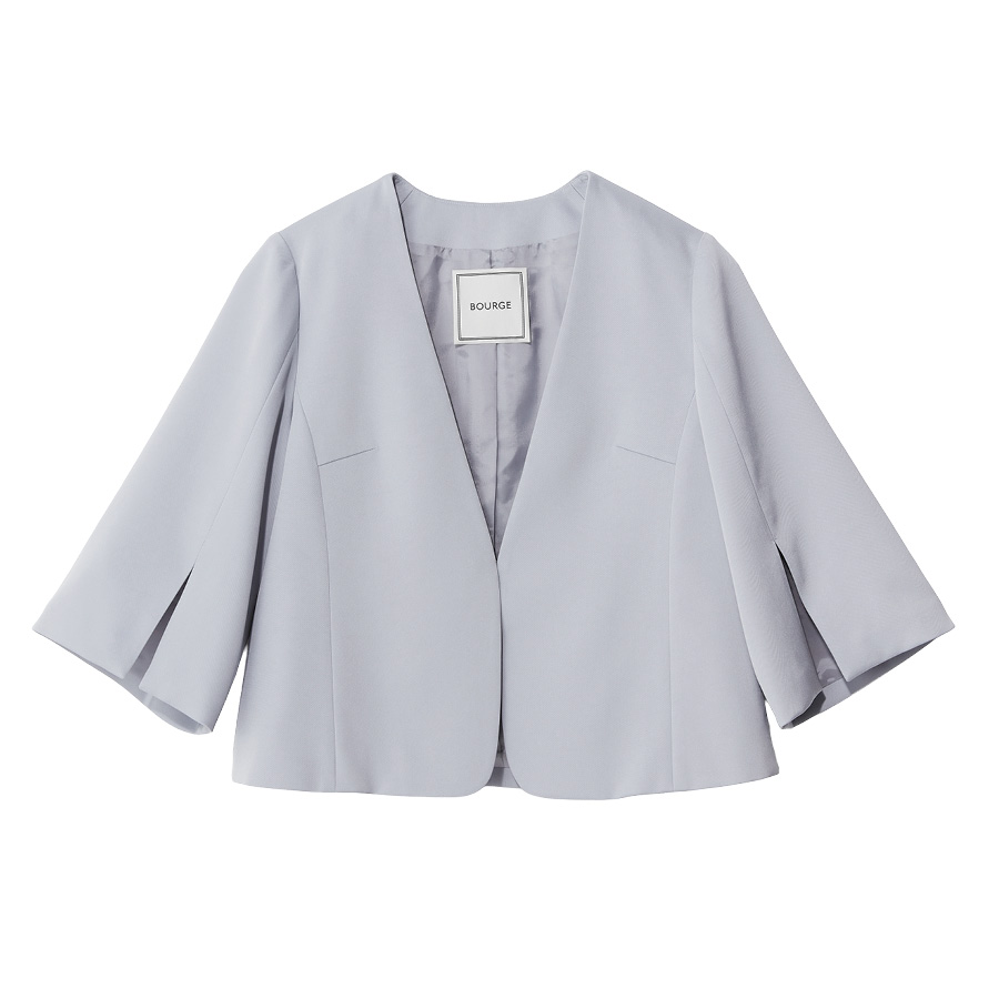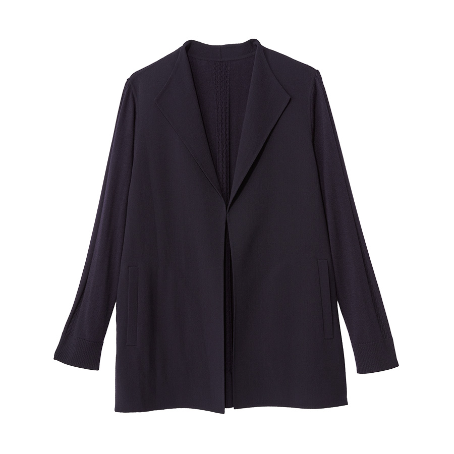 ■With Sophisticated Styleリバー素材の布帛にニットを手仕事で組み合わせた一重仕立てのジャケットは、風になびく軽やかさ。