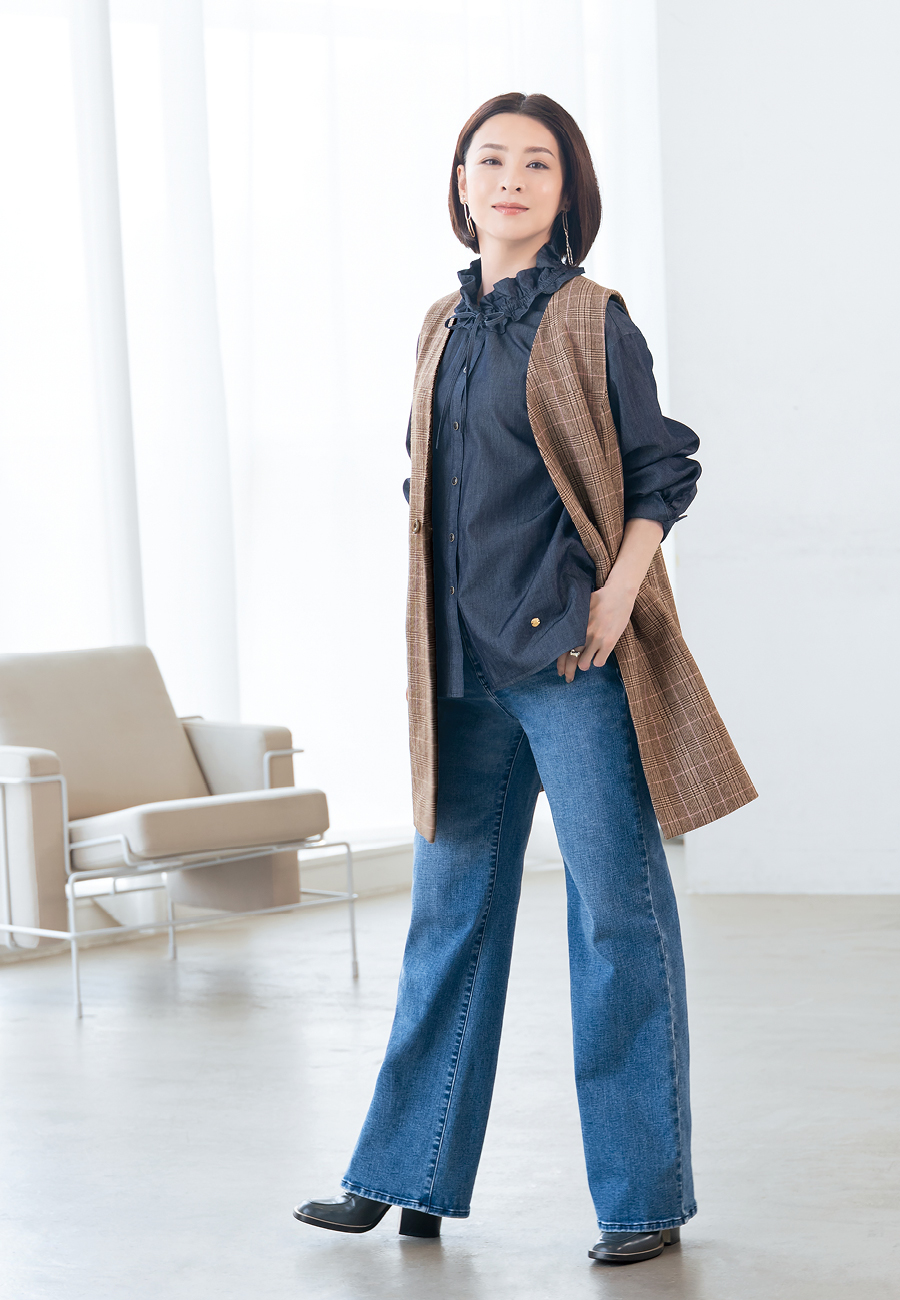 クラシカルなチェックのジレと、表情も着心地も異なるデニム・オン・デニムを合わせた着こなしが新鮮。