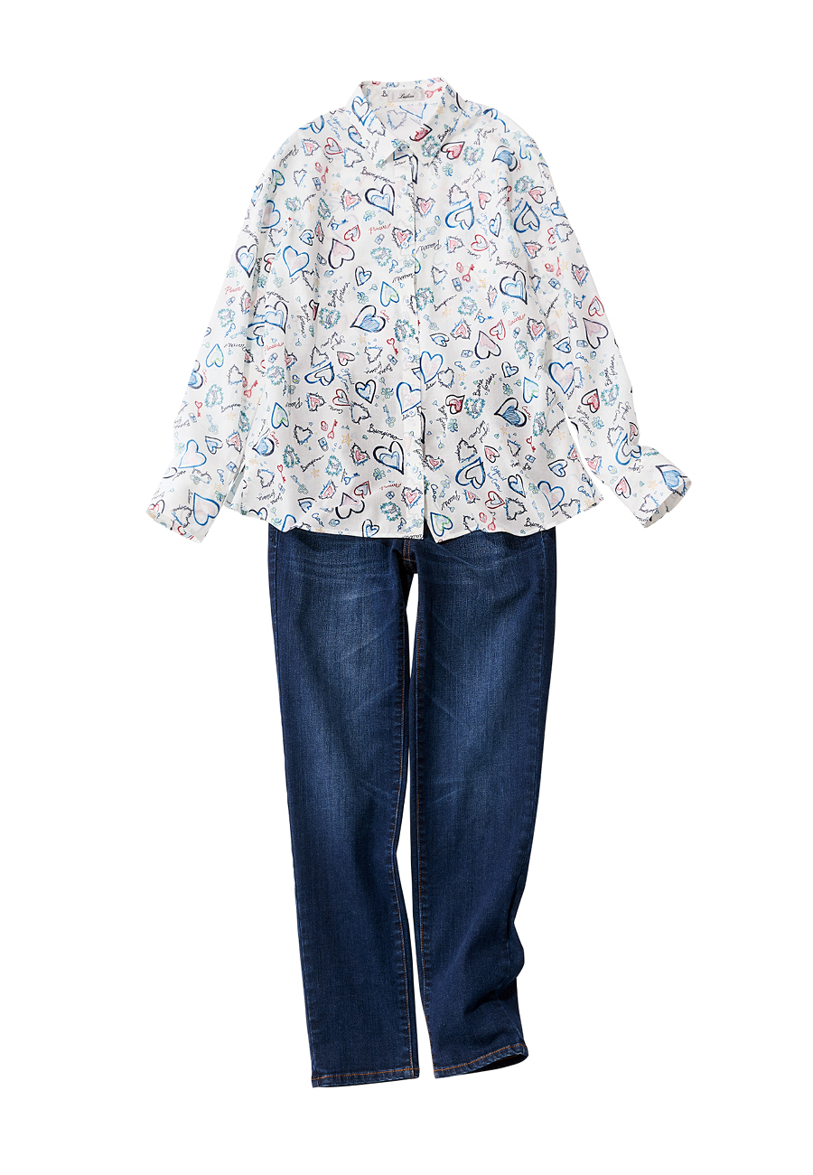 チアフルなプリントブラウスを、インディゴブルーでクリーンに引き締めて。ブラウス¥49,500