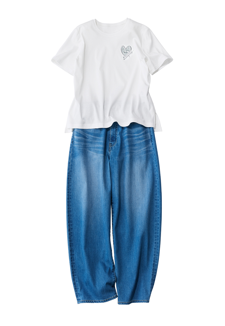 まろやかな曲線を描くワイドシルエットが、胸元のモチーフがポイントのTシャツとのデイリーな着こなしも鮮度よく仕上げます。Tシャツ¥31,900