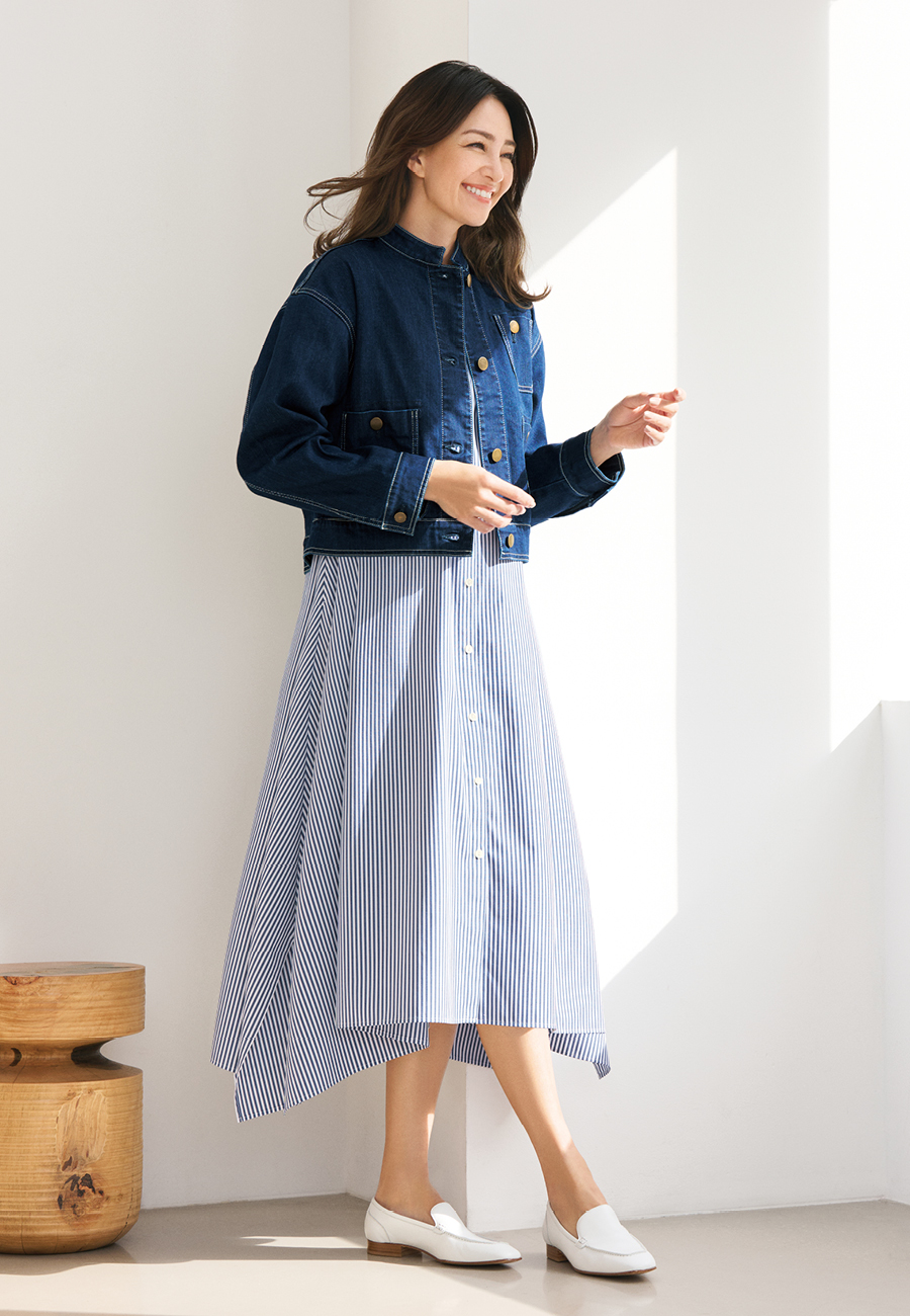 風に揺れるイレギュラーヘムのシャツワンピースで爽やかに。ジャケット(L-JEANS)¥52,800
