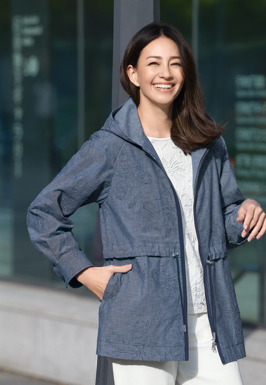 な柄を配した軽やかなコートは、ウエストを絞ればシルエットも自在に。