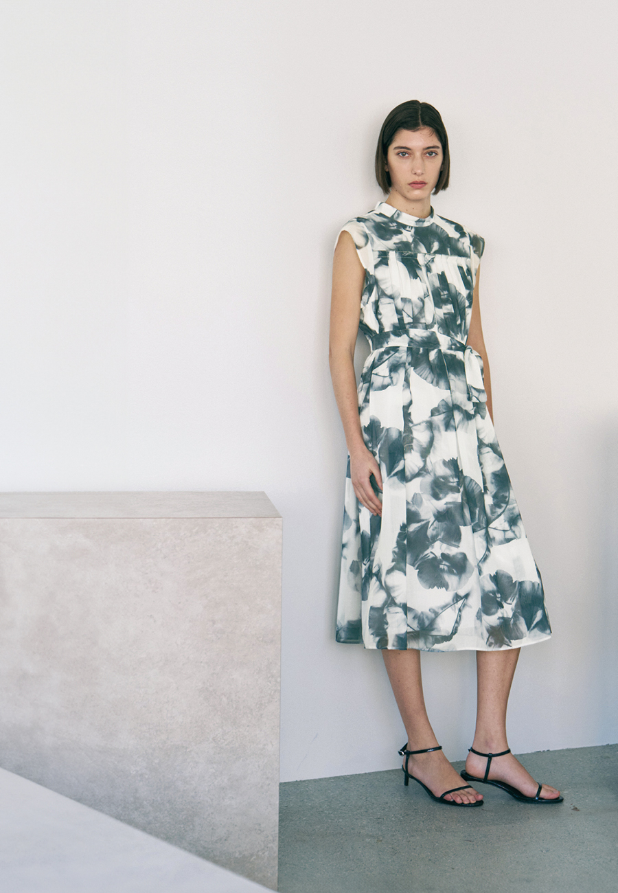 コンストラクティブなフォルムや素材の表情にこだわりながら、ドレープやフリルといったフェミニンな要素を加えることで、ただシンプルなだけではない、奥行きのあるスタイルを描き出します。ドレス¥75,900