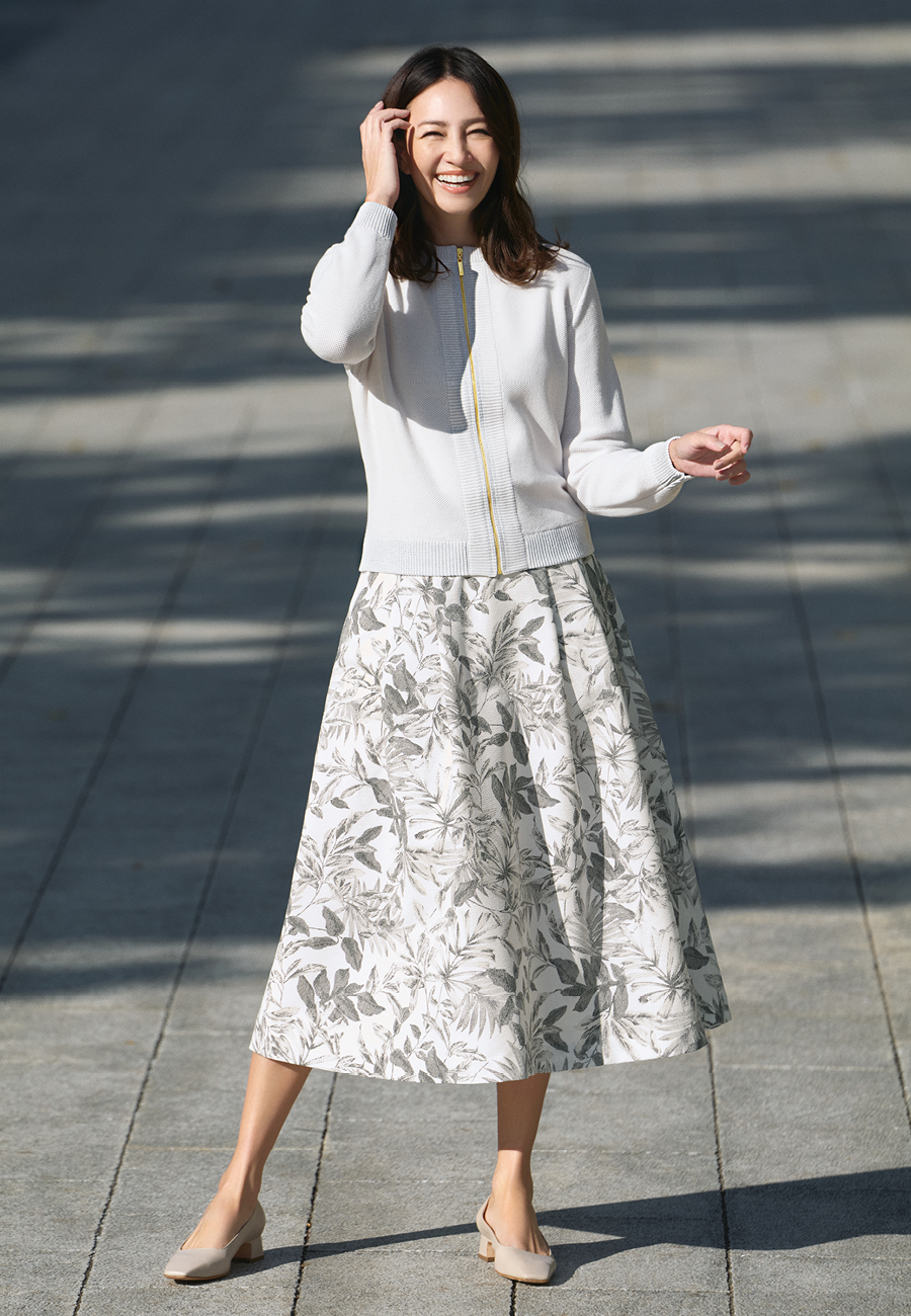 ボリューム感のあるプリントスカートを合わせて品よくカジュアルに。ニットブルゾン¥49,500