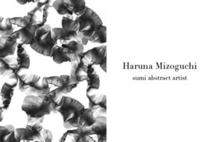 溝口春菜さんの墨抽象作品は、白でも黒でもない、丸でも三角でもない、どこかで途切れず、どこまでも続いていくような世界を描いています。筆、墨、 和紙。素材と対話しながら生まれる線やかたちは、コントロールしきれない大胆さと、息をひそめるような繊細さを同時に内包しています。
